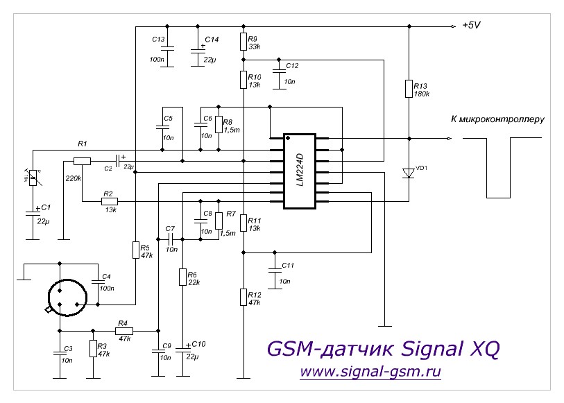 Она выполнена на счетверенном операционном усилителе LM224. Резистором R1 – устанавливают усиление (чувствительность датчика).