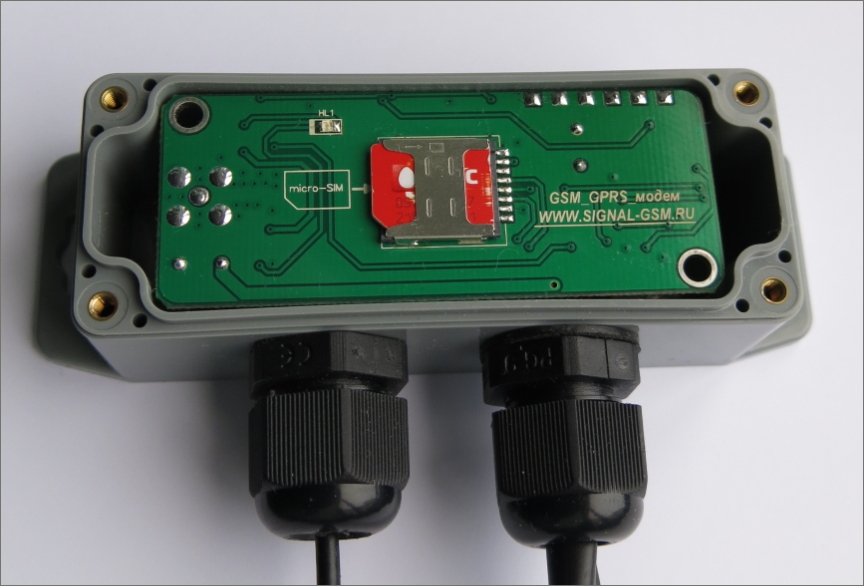 GSM/GPRS-модем, выполнен в герметичном пыле-влаго защищённом (IP65), пластиковом корпусе с фланцами для крепления к стене.Из корпуса, через гермовыводы, выходят три кабеля: RS232 (COM-порт), питание с USB-разъёмом на конце и антенна.